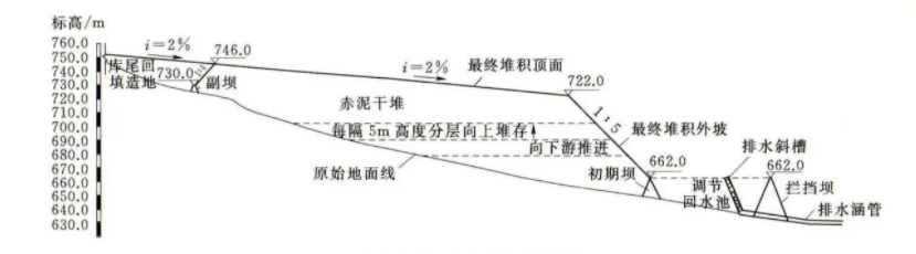 山西某赤泥干堆場為自然山谷,四面山體合圍。公司主要生產(chǎn)氧化鋁產(chǎn)品,設(shè)計(jì)生產(chǎn)規(guī)模為氧化鋁110.00×10t/a、赤泥136.96×10t/a,生產(chǎn)工藝為拜耳法。赤泥采用濕法渣漿輸送方式,經(jīng)壓濾車間壓濾脫水后采用干堆方式進(jìn)行堆存。該赤泥尾礦庫設(shè)計(jì)最終堆積頂部標(biāo)高為746.0m,下游堆積壩分13級臺(tái)階堆筑,每級臺(tái)階高度為4.0m,共計(jì)52.0m,最終堆積頂部標(biāo)高為722.0m。尾礦干堆場總壩高為98.0m,總庫容為1904.68×10'm3,服務(wù)年限為15年。尾礦庫縱剖面圖見下圖。