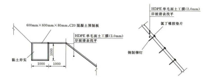 側(cè)陡峭山坡上鋪設(shè)土工膜時(shí),用止水橡皮和錨桿將其錨固在邊坡上,以防土工膜倒卷下